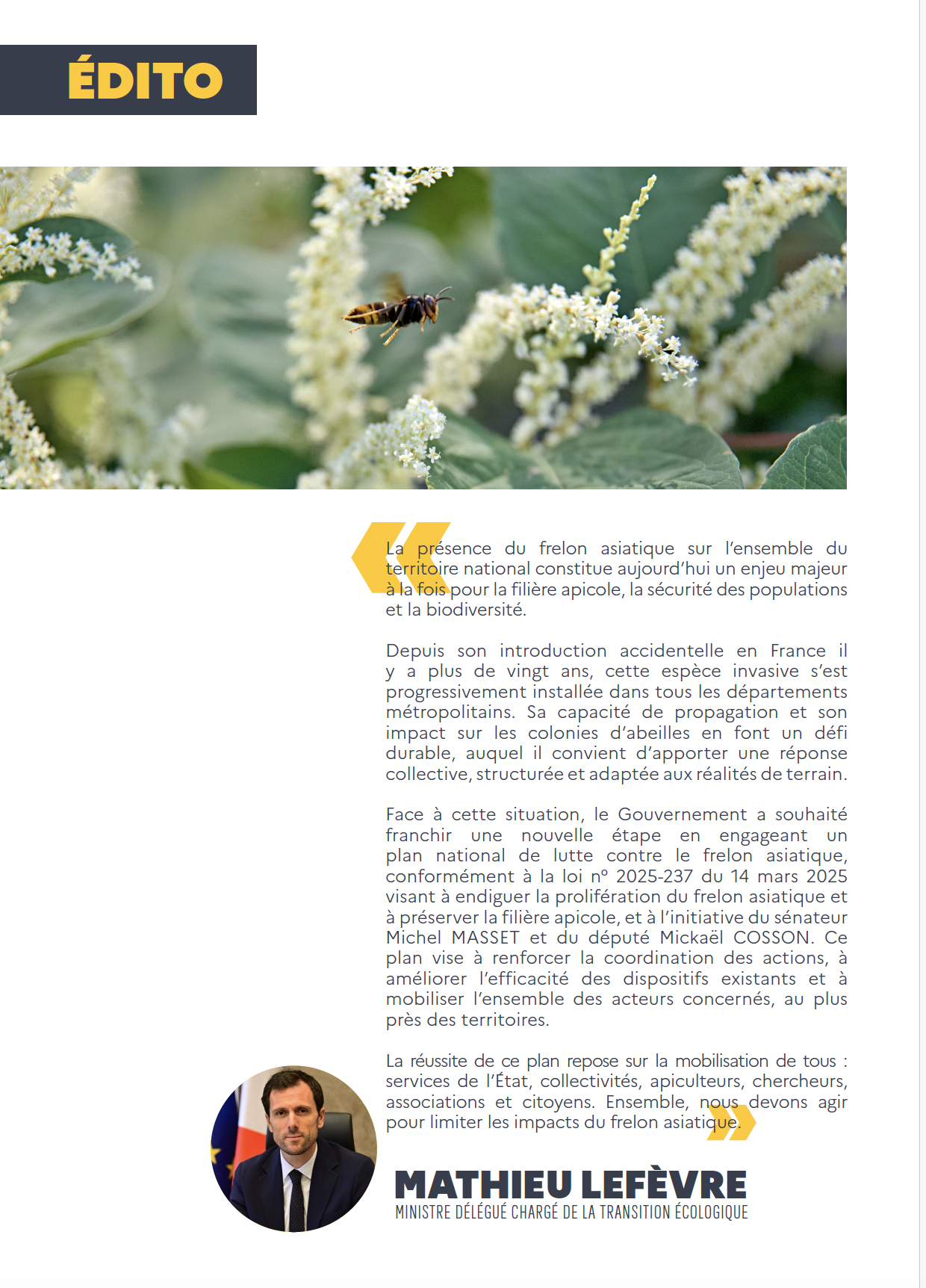 Communiqué de presse du Ministre MATHIEU LEFÈVRE MINISTRE DÉLÉGUÉ CHARGÉ DE LA TRANSITION ÉCOLOGIQUE se referant à la loi "Frelon"